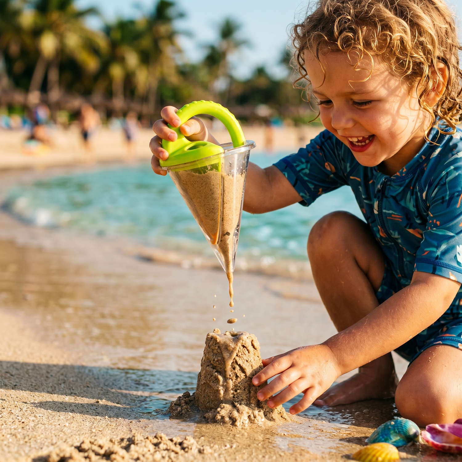 The ultimate beach toy for kids ofall abilities. Fill with sand & water, watch them mix through the transparent funnel, and create stunning drip-castles, towers & sand art, no skill needed. BPA-free, ergonomic, and built to last.